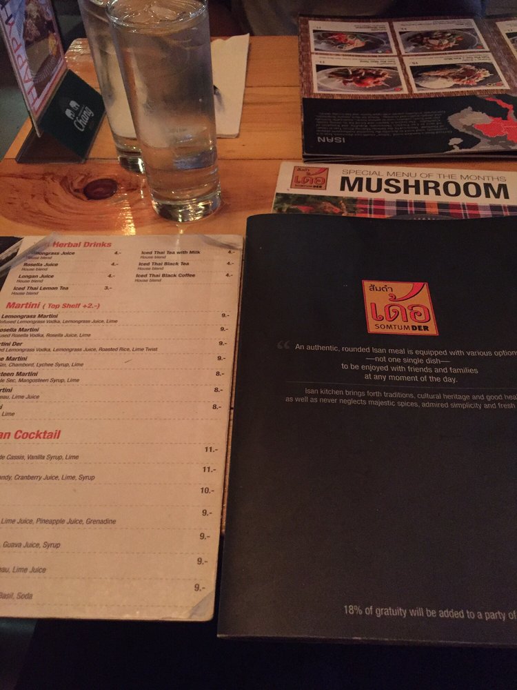Mixed mushroom in lemongrass and yanang leaves extract soup filled with sliced pumpkins, sweet basil, and fermented fish sauce isan-style.